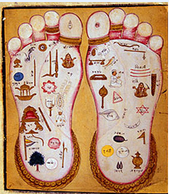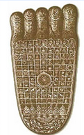En Asie : L’empreinte du pied de Bouddha est illustrée par différentes petites cases. Par exemple, dans cette représentation, les orteils correspondent à la tête, siège de l’intelligence et de la plupart de nos organes sensoriels tels que l’ouïe, la vue, l’odorat, le gout…